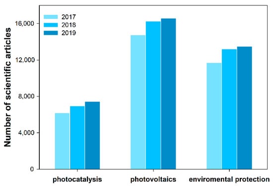 Currently, the issues related to environmental pollution and renewable energy technologies play a key role in environmental protection. It should be noted that an economy based on fossil fuels results in a growing amount of environmental waste, including sewage as well as air pollution [,,]. It is estimated that the reserves throughout the world could only last for 40 years in the case of oil, 60 years for natural gas and 200 years for coal. Therefore, a change of strategy which entails the development of new technologies [] that will not have a negative impact on the natural environment [] is one of the most important goals for humans. To this end, green chemistry assumptions have been developed and, in recent years, they have been focused on processes such as the photocatalysis [] or dye-sensitized solar cells (DSSC) []. The growing interest in the above-mentioned processes is also reflected by the increasing number of scientific articles. A summary of the number of searches in the Scopus database over the past three years for keywords such as photocatalysis, photovoltaics and environmental protection are presented in Figure 1.