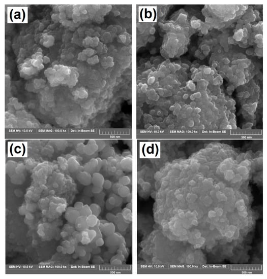 The SEM images of: (a) TiO2; (b) TiO2_PEG; (c) TiO2_Pluronic P123 and (d) TiO2_Triton X−100.