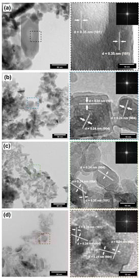 Based on the TEM image obtained for the reference sample (TiO2), it should be noted particles with a rod-like shape were observed. Moreover, the particles are characterized by a diameter of approximately 50 nm and length of 150 nm. In addition, the crystallographic spacing of 0.35 nm which matches well with the (101) plane of anatase was observed in the high-resolution images (Figure 3a). For the TiO2_PEG material, cubic-like particles were observed, with a diameter of approximately 25 nm. Furthermore, it should be emphasized that polyethylene glycol-modified titania is characterized by smaller particles compared to the reference sample. Moreover, the crystallographic spacings of 0.35 and 0.24 nm which match well with the (101) and (004) planes of anatase were observed for the above-mentioned material. Otherwise, it was found that the difference in the FFT images is associated with the change of crystallinity (Figure 3b). However, it should be noted that the Pluronic P123-modified TiO2 (sample TiO2_Pluronic P123) is characterized by rod-like and octahedral shapes of particles. Additionally, the crystallographic spacings characteristic for (101) and (004) planes of anatase were observed. The analysis of the HRTEM results indicates that aside from the crystallographic spacings of 0.35 nm, spacings of 0.24 nm were also determined in the rod structure. Significant changes in the crystallinity of the materials were shown based on the FFT images (Figure 3c). For the TiO2_Trition X−100 sample (Trition X−100-modified TiO2), the rod and cubic-like shape particles can be observed. Additionally, the rod particles possess a diameter of approximately 25 nm and length of approximately 50 nm. Moreover, the diameter of the cubic structure is equal to approximately 15 nm. Furthermore, in case of the Triton X−100 modified titania the lattice fringes matching well with the (101) and (004) planes of anatase were observed (Figure 3d).