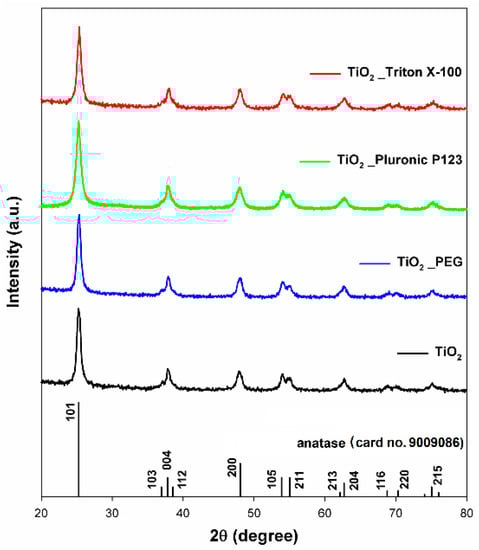 Based on the presented results (Table 1), it was found that the inclusion of surfactants into the microwave-assisted synthesis of titanium dioxide influences the crystallite size. In the case of the reference sample TiO2, the crystallite size was equal to 15.2 nm. The addition of Triton X−100 and polyethylene glycol (PEG) improves the crystallinity of synthesized nanomaterials (17.4 and 16.9 nm, respectively). While the introduction of Pluronic P123 to the reaction system resulted in the opposite effect—deterioration of crystallinity (9.8 nm).