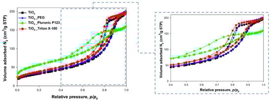 A textural structure is one of the most critical parameters (e.g., dye adsorption, diffusion of electrolyte, light scattering) in all processes using the light (UV or Vis). In order to determine the parameters of the porous structure, the BET analysis was carried out. The isotherms of low-temperature N2 adsorption/desorption were presented in Figure 5. Moreover, the parameters of the porous structure for obtained TiO2 nanomaterials were presented in Table 2.