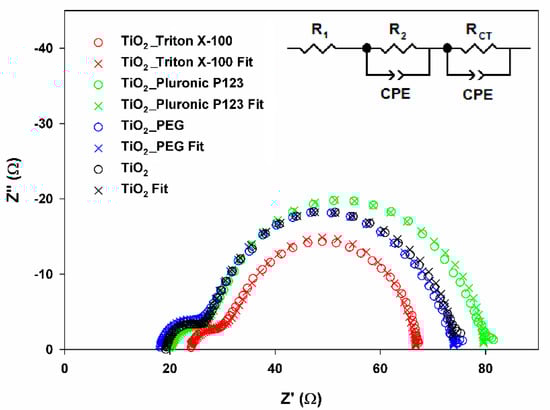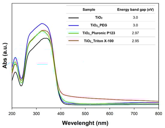 The plot of the Kubelka–Munk function versus the photon energy gives indirect band gaps of 3.0 eV for the reference TiO2 and TiO2_PEG, while value equal to 2.97 eV and 2.95 eV were observed for samples modified with Pluronic P123 and Triton X−100, respectively. The energy band gaps of analyzed nanomaterials were similar to those reported for titania [,], which indicates that the surfactants-assisted microwave-synthesis does not influence the energy band gap.