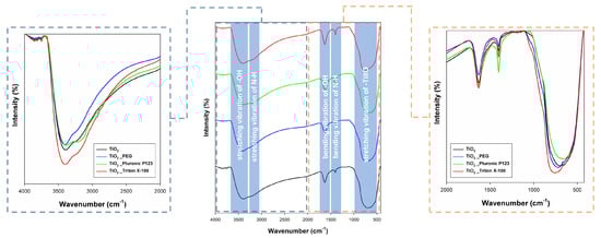 The band characteristic for strong stretching vibration of the groups −Ti≡O (715 cm−1) was observed. Moreover, in the case of synthesized titania nanomaterials, the stretching vibrations (3150 cm−1) and bending vibrations (1400 cm−1) of the N-H groups were observed, which is associated with the use of the ammonia solution as a pH regulator during the synthesis of titania nanoparticles. Furthermore, it should be noted that all obtained materials were characterized by stretching vibrations (3450 cm−1) and bending vibrations (1600 cm−1) of the hydroxyl group (−OH). Based on the presented results, it has been established that the obtained FTIR spectra include bands characteristic for titanium dioxide. Moreover, it has been found that the change of surfactants does not influence the presence of the bands in the FTIR spectra. The surfactants-assisted synthesis only affects the change of the intensity of characteristic bands.