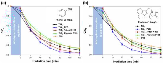 The photocatalytic activity of the obtained titania nanomaterials was evaluated based on the degradation of phenol (20 mg/L) and etodolac (15 mg/L). The results of photodegradation are presented in Figure 9.