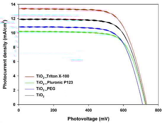 In order to investigate more extensive application possibilities and achieve a more comprehensive characterization of studied materials, a series of dye-sensitized solar cells have been prepared using the surfactant-assisted titania as a porous semiconducting layer of working electrodes. The photovoltaic parameters of the prepared devices have been tested under simulated solar light, and the I-V characteristics curves have been presented in Figure 10, while the main parameters were listed in Table 4. The open-circuit photovoltage (VOC) varied in the range between 710 and 734 mV for TiO2_PEG and TiO2_Triton X−100 devices, respectively, and this was not a significant variation which most likely had a minor influence on the performance of investigated cells. As the VOC parameters correspond to the Fermi level of the semiconductor and the Nernst potential of the redox couple in the electrolyte [], the observed variation is plausibly caused by the changes in the electronic structure of the particular materials, which is supported by the observations made in DRS experiments described above. The Fermi level shift may be one of the probable reasons for the bandgap changes and, in consequence, for the variation of the observed VOC values. The fill factors (FF), which are the result of energy loss related to the inherent resistance of the cells, are also varied slightly between the investigated devices. The FF values are reasonable for the DSSCs and indicate no internal short circuits or electric breakdowns in the cells. More interesting differences may be observed in short circuit photocurrent density (JSC) values, which ranged from 10.3 to 13.5 mA/cm2 for TiO2_Pluronic P123 and TiO2_Triton X−100, respectively. The amount of dye adsorbed on the electrode surface (Ndye) [] is one of the factors that influencing JSC, as with increasing the number of dye molecules adsorbed on the electrode, more excited electrons may be generated, and higher photocurrent may be observed. In the studied case, the Ndye values strongly correspond with the JSC values, and the lowest photocurrent has been observed for the TiO2_Pluronic P123 device in case of which also the lowest Ndye value has been found. Moreover, the highest Ndye value has been found for the TiO2_Triton X−100 device, in the case of which the highest JSC was also registered. However, the influence of another phenomenon regarding the JSC was observed in case of the two other materials, i.e., TiO2_PEG and TiO2. As the Ndye value for the former was slightly higher, the JSC is significantly lower than for the latter. This can be most likely explained by the internal recombination of the photoexcited electrons, which is more efficient in the case of the TiO2_PEG device. As the N3 dye includes –COOH anchors, the dye loading depends mainly on the number of accessible surface hydroxyl groups on the electrode material []. The TGA results, presented in Table 3, clearly show the differences in the concentration of surface −OH groups between the investigated materials. Surprisingly, the material with the highest −OH groups concentration is characterized by the lowest Ndye values and, in consequence, the lowest JSC. This observation can be explained, when the porosimetry (see Table 2) and XRD (see Table 1) results are compared together with −OH groups concentration. After analysis of those three groups of parameters, it can be observed that the TiO2_Pluronic P123 material exhibits the smallest crystallite sizes, which supports the more complex mesoporous structure giving the highest surface area that should support the dye loading. However, the observed pore volumes and diameters are the smallest, and therefore the surface may not be accessible for the bulky N3 dye molecules. This effect strongly affects the dye adsorption ability, which decreases independently at the highest concentration of surface −OH groups, resulting in poor performance of TiO2_Pluronic P123 photovoltaic devices []. The final JSC performances should be considered as a sum of both phenomena described above. The overall photon to current efficiency (η), which is the result of the photovoltaic parameters described above, represents the most variable parameter, i.e., JSC, and is in a range from 5.32 to 6.84% for TiO2_Pluronic P123 and TiO2_Triton X−100, respectively.