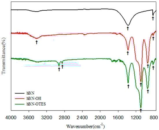The broad B-N stretching was observed, including in-plane stretching vibration (B-N, 1378 cm−1) and the out-of-plane bending mode (B-N, 809 cm−1), as shown in Figure 2. After oxidation (hBN-OH), representative peaks such as those corresponding to hydroxyl group stretching (-OH, 3200–3500 cm−1), in-plane stretching vibration (B-O, 1090 cm−1) and the out-of-plane bending mode (B-O, 938 cm−1) were also observed. Characteristic peaks of hBN-OTES occurred at 2850 cm−1, 2925 cm−1 (C-H stretching vibration), and 1100 cm−1 (Si-O-C vibration), furthermore, the intensity of the –OH peak decreased significantly after surface modification of hBN-OH with OTES, indicating that hBN-OTES was successfully synthesized.