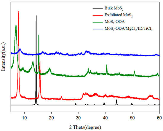 X-ray diffraction (XRD) pattern of bulk MoS2, exfoliated MoS2, MoS2-ODA, and MoS2-ODA/MgCl2/ID/TiCl4.