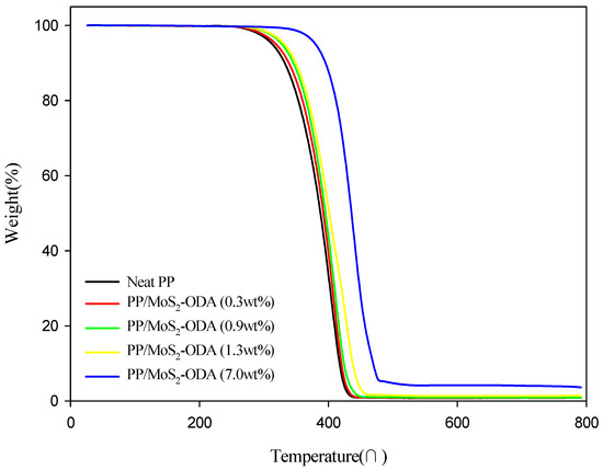 As shown in Figure 5, the TGA curves revealed a one-step degradation process and the thermal degradation temperatures increased with increasing 2D-nanosheet content. The degradation temperatures of PP/MoS2-ODA nanocomposites (Td5%) are higher than that of neat PP. For 0.9, 1.3 and 7.0 wt % MoS2-ODAcontent of PP/MoS2-ODA nanocomposites, the Td5% of composites was 14, 19 and 67 °C higher than that of PP. With regard to 1.3 wt % MoS2-ODA loading, the maximum degradation temperature was 22 °C higher than that of PP. A distinct increase in thermal stability was due to MoS2 being well-dispersed in the PP matrix. The introduction of 2D-nanosheets into PP can improve the thermal stability of PP, besides the fact that MoS2 exhibits good thermal stability. The improvement in thermal stability can be attributed to the called “tortuous path” barrier effect of MoS2, which delays the escape of volatile degradation products and thus slows down the initial degradation step [28].