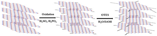 hBN oxide (hBN-OH) was prepared from hBN following a modified Hummers’ oxidation method. hBN-OH was prepared as follows: hBN (0.5 g) and KMnO4 (6 g) were mixed and a mixture of phosphoric acid/sulfuric acid (1/8 wt/wt, 150 mL) was added to this mixture. The oxidation was performed at 140 °C for 24 h under reflux, and the product was washed with H2O/EtOH and HCl solution. The synthetic procedure of alkylsilane modified hBN (hBN-OTES) is illustrated in Scheme 2. During the process, hBN-OH (0.1 g) was dispersed in EtOH/H2O (95/5 vol/vol, 100 mL) via 2 h of ultra-sonication and OTES (3 mL) was subsequently added to the dispersion. The mixture was stirred for 24 h at 90 °C under reflux and EtOH was then added to remove unreacted silane compounds. Afterward, the obtained products were dried under vacuum at 100 °C. (Scheme 2)