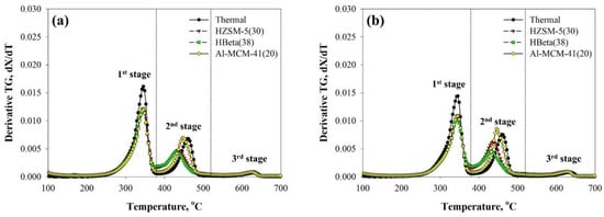 DTG curves of (a) TP-1 and (b) TP-2 obtained from their thermal and catalytic pyrolysis at 10 °C/min.