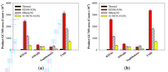 Comparison of GC/MS areas (count × 10-6) for total aromatic hydrocarbons (TAHs) obtained from the catalytic pyrolysis of (a) TP-1 and (b) TP-2 at 650 °C.