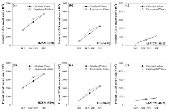 The synergistic effect between the catalytic pyrolysis intermediates of SKP and SPE during their catalytic co-pyrolysis was also evaluated in this study by comparing the theoretical and calculated GC/MS peak area of total aromatic hydrocarbons. The experimental values were obtained by injecting the same amounts of SKP and SPE into the sample cup with the same amount of catalyst. The calculated yields were obtained by summation of the peak areas of the aromatic hydrocarbons obtained from the individual catalytic pyrolysis of SKP and SPE. As shown in Figure 5, the experimental GC/MS peak areas of total aromatics obtained from the catalytic co-pyrolysis of SKP and SPE over HZSM-5(30) and HBeta(38) were much higher than the calculated ones, suggesting the synergistic formation of aromatics by co-feeding the SKP and SPE on the formation of aromatic hydrocarbons. The synergistic effect was also differentiated by the properties of the catalyst. Microporous catalysts, such as HZSM-5(30) and HBeta(38), enable a sufficiently high Diels–Alder reaction efficiency by providing high shape selectivity and sufficient amounts of acid [32,45]. The additional formation of aromatics on the catalytic co-pyrolysis of biomass and thermo-plastics could be enhanced by the additional Diels–Alder reactions between the catalytic pyrolysis intermediates from biomass, mainly furans, and those of plastics, i.e., light olefins [54]. Large amounts of light olefins could react with the furans, which would lead to the additional formation of aromatics over HZSM-5(30) and HBeta(38). Al-MCM-41(20) produced smaller amounts of aromatic hydrocarbons and light olefins than HZSM-5(30) and HBeta(38) because an efficient Diels–Alder reaction efficiency during catalytic pyrolysis would be decreased by the large pores and the weakly acidic catalyst, as shown in Figure S1 [56,57].