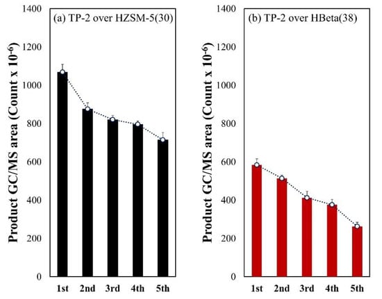 Figure 6 shows the results of the catalyst deactivation test during five sequential catalytic pyrolysis cycles of TP-2. During the sequential pyrolysis, HZSM-5(30) produced a larger amount of aromatic hydrocarbons than HBeta(38). The decrease of GC/MS peak area of total aromatics over HZSM-5(30), 33.1% of first run after the fifth run, was lower than that (55.5% decrease) over HBeta(38). This suggests that HZSM-5(30) allows a longer lifetime than HBeta(38) during the sequential catalytic pyrolysis process of TPs.