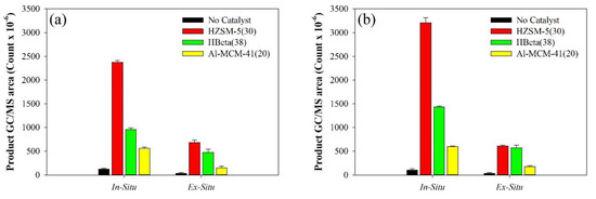 Figure 7 presents a comparison of the in-situ and ex-situ use of the catalysts for the pyrolysis of TP-1 and TP-2. The in-situ catalytic pyrolysis of TPs produced a larger amount of aromatic hydrocarbons compared to the ex-situ reaction. Other researchers [58,59] also determined the efficiency of in-situ catalytic pyrolysis to be higher and attributed this to more effective contact between the reactant and catalyst in the in-situ reaction and the possibility of radical reactions which may limit further reactions in catalyst pores in the ex-situ configuration.
