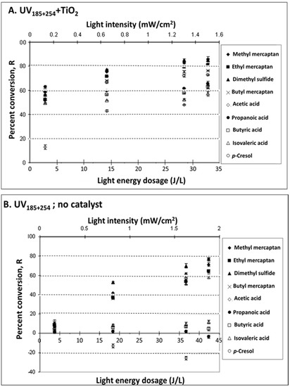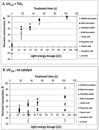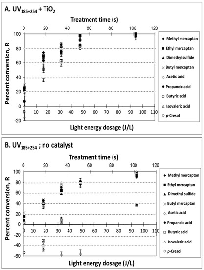 Treatment of target odorous VOCs in a synthetic mixture with UV lights of 254 nm principal output (i.e., no deep UV 185 nm output). Effects of measured light energy dosage (at different treatment times) on VOC percent conversion, R: (A) UV254 + TiO2 (treatment mainly via photocatalysis); (B) UV254, no catalyst (treatment mainly via photolysis). Experimental conditions: UV intensity at 254 nm, 312 nm and 365 nm was 1.5, 0.230, and 0.084 mW cm−2, respectively; 25 mg TiO2; T = 25 °C; dry air; sampling conditions: 5 min SPME sampling time with CAR/PDMS 85 μm. The light energy dosage is based on the output at 254 nm only.