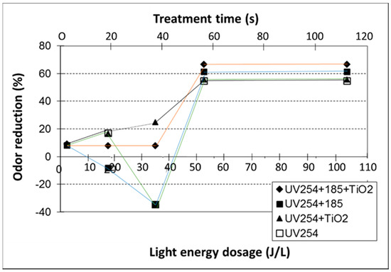 Significant odor reduction (measured by dilution olfactometry) was observed in UV185+254 + TiO2 and UV254 + TiO2 treatment processes for light energy level >50 J L−1 (Figure 4). Odor generation was observed at low-energy-dose treatments (I < 40 J L−1) without a catalyst. This is likely due to the generation of low-molecular-mass fatty acids, as shown in Figure 1, Figure 2 and Figure 3 or less offensive odorants.