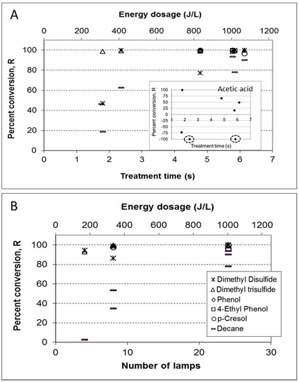 The results show the effective removal of key malodor compounds in poultry manure (dimethyl trisulfide (DMTS) and dimethyl disulfide (DMDS), p-cresol, phenol, and 4-ethyl phenol) in short treatment times. Decane (which appeared in most samples but is not considered as a key odorant) showed more dependence on energy dose, either at the shorter treatment times or lower light intensities. The results obtained for acetic acid (Figure 5A; inset) were not consistent and varied from positive (i.e., net removal) to negative (net formation) R, with no clear dependence on energy dose. These observations were consistent with the experiments done with synthetic VOCs mixture (where acetic acid was generated under certain conditions).