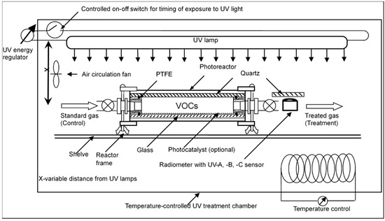 A scheme of the lab-scale UV photoreactor (0.57 L) in a temperature-controlled chamber. The system includes a data acquisition system for (1) UV lamp status and electric voltage and current; (2) UV light intensity; and (3) light intensity controlled with distance “x” between the lamp and treated air.