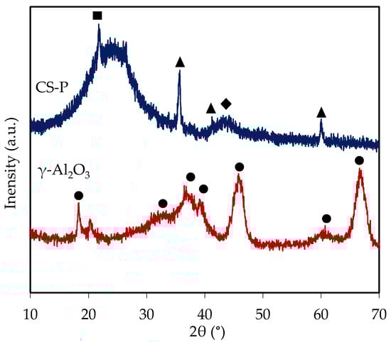 Figure 1 shows the X-ray diffractograms of the supports: γ-Al2O3 and phosphorous-impregnated carbon composite (CS-P). For the γ-Al2O3 support, the main peaks are observed at 2θ = 18.9°, 32.5°, 36.9°, 39.1°, 45.3°, 59.6° and 66.7° characteristic of this low crystallinity aluminum oxide (●) (JCPDS 04-0858).