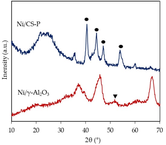 The results of the adsorption-desorption of N2 show a drop in the value of SBET for the reduced Ni/γ-Al2O3 catalyst, which is due to the blocking of the pores due to the presence of Ni. Conversely, for the Ni/CS-P catalyst, there is an increase in SBET, which could be assigned to the loss of some AlPOx species of the support, during the thermal treatment in H2 flow, that were blocking the support pores. It has been reported in the literature that the thermal treatment of phosphoric acid species in carbon is employed to increase the specific area []. Isotherms and pore size distributions of the catalysts are shown in Supplementary Figures S1 and S2.