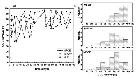 In an attempt to analyze the stability of the MFCs, as well as to obtain descriptive parameters of the average performance of the electrochemical devices and the effects under study, the frequency of the measured efficiency values of the cells was obtained. A preliminary inspection of Figure 1b shows that the frequency dispersion of the COD removal efficiencies for the MFCT system is characterized by the smallest variation, as well as by the largest frequency, with values above 80%. In contrast, for MFCE and MFCW, the most frequent removal values fell in the 60% to 80% range. To properly analyze the data that could shed light on the effect of the cathode design of the cells on the COD removal efficiency, a statistical analysis was performed using the Kruskal–Wallis and Kolmogorov–Smirnov non-parametric tests. The resulting data show that MFCW and MFCE do not show significant differences between each other, which indicates that the presence of the wetland in the cathodic zone has no statistically relevant effect on the COD removal efficiency. The results for MFCT, on the other hand, reveal that the cathode design, and particularly the forced aeration that characterizes the cell, results in a significant difference, which shows a positive effect on the organic load removal efficiencies (Table 1).