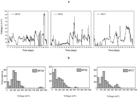The systems under study showed large variations in voltage generation during the first 90 days of operation (Figure 2a). The observed dispersion ranged between 50 and 900 mV, with the most frequent values falling in the 150 to 400 mV range. As can be seen in Figure 2b, where the frequencies of the generated voltage values are presented, MFCW and MFCT show that the most frequent values of the generated produced voltage are located between 100 and 350 mV. In contrast, MFCE is characterized by substantially lower values in the 0 to 100 mV range. It is also important to point out that voltage generation in MFCs usually reaches maximum values between 300 and 700 mV, depending on the operating conditions, temperature and configuration [6,31]. According to these reports, voltage production in our systems is within the typical range that is expected for a microbial fuel cell.