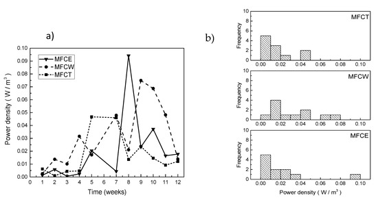 As expected, the evolution in power density for the three systems was incremental during the first 7 weeks (Figure 4a). For MFCW, the power density was about 0.015 W/m3 after 2 weeks of operation, and steadily increased until reaching a value of 0.08 W/m3 in week 9; later, the power decreased until reaching a value of 0.02 W/m3. For MFCT and MFCE, on the other hand, the power values obtained during the first 4 weeks were low (0.005 W/m3 or less) and steadily increased until the maximums of 0.05 W/m3 and 0.095 W/m3 were obtained. The frequencies of the observed values for power density are shown in Figure 4b, where it can be easily noticed that the highest values of power were more frequent for MFCW, followed by MFCT and MFCE.