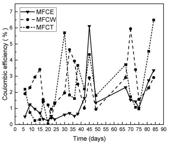 Coulombic efficiency was also analyzed for the fuel cells under study. As can be seen in Figure 5, while the values obtained during the first 25 days were higher for MFCW (3.5%) and lower for MFCE and MFCT, an increase in the efficiency between 3% and 6%, was observed and maintained for all the systems under study. In this way, the maximum coulombic efficiency for MFCT was 6.49%, and the corresponding values for MFCW and MFCE were 5.95% and 6.1%, respectively. It is interesting to note that these low efficiency values are typical in microbial fuel cells, and are fully explained because not all organic matter can be converted into electrical energy, since an important fraction is used by microorganisms to perform their vital functions [16]. While low coulombic efficiencies indicate that a large part of the organic matter did not contribute to energy generation, low coulombic efficiency values are also due to substrate consumption by mixed microbial consortiums that populate the system [31].
