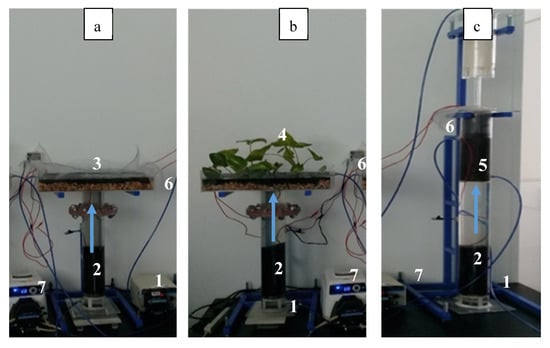 Experimental arrangement of the 3 up-flow MFCs under study (a) MFCE, (b) MFCW and (c) MFCT. (1) Wastewater influent (2) GAC anodes, (3) GAC cathode, (4) GAC cathode-wetland, (5) GAC cathode with a recirculation tower, (6) treated wastewater effluent, (7) peristaltic pump.