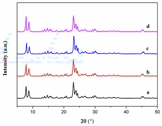 XRD patterns of HZSM-5 catalysts with different Na/Al ratios in synthesis gels. (a) HZ(0), (b) HZ(0.4), (c) HZ(0.8), and (d) HZ(1.1).