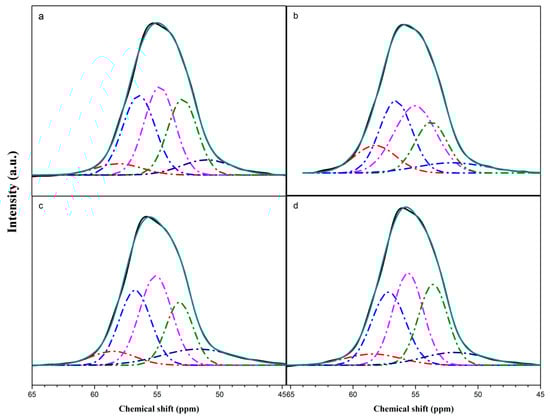 Deconvolution of the 27Al-MAS NMR spectra of (a) HZ(0), (b) HZ(0.4), (c) HZ(0.8) and (d) HZ(1.1) catalysts.
