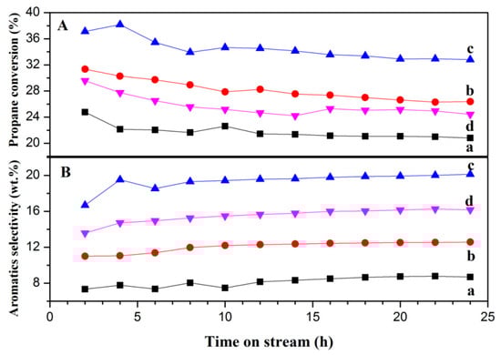 Propane conversion (A) and aromatics selectivity (B) with the time on stream (TOS) over HZSM-5 catalysts: HZ(0) (a), HZ(0.4) (b), HZ(0.8) (c) and HZ(1.1) (d). at 550 °C with weight hourly space velocity (WHSV) of propane being 0.6 h−1 and N2/C3H8 ratio being 2.5 in feedstock.