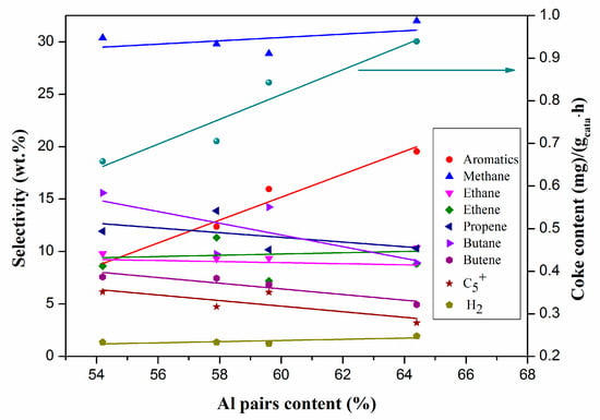 The results of GC-MS and micro reactor activity estimation indicate more Al pairs in the catalysts enhance the oligomerization of alkenes (especially propene) and produce more aromatics, which is consistent with the results of catalytic performance tests.