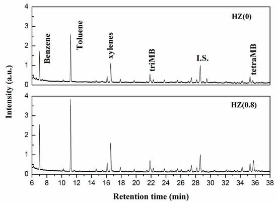 To investigate the initial products retained in the catalysts during propane aromatization, the catalytic performances of HZ(0) and HZ(0.8) catalysts were comparatively evaluated by pulse experiments at 500 °C. As illustrated in Figure 7, the products deposited on catalysts are mainly benzene, toluene, xylenes, trimethylbenzenes (triMBs) and tetramethylbenzenes (tetraMBs). Comparing with the soluble coke of two catalysts, the HZ(0.8) catalyst possesses more aromatics, especially benzene, toluene, xylenes.