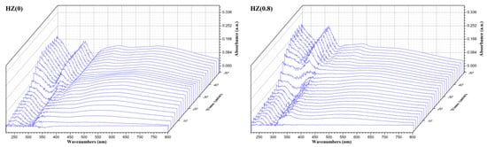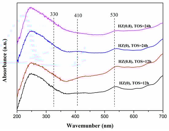 DR UV-vis and FTIR spectra were employed to analyze the coke species deposited in the used catalysts. The DR UV-vis spectra of the used HZ(0) and HZ(0.8) catalyst are shown in Figure 9. The bands at ~330 and ~410 nm are ascribed to dienyl carbocations/low methylated benzene carbocations and highly methylated benzene carbocations, respectively []. As for the band at ~530 nm, it may be caused by phenanthrene, anthracene carbocations, deposited pyrene and/or more benzene rings-fused aromatic molecules [,]. It is noticed that the coke species are similar for these two catalysts. However, one cannot determine precise differences between the different reaction species with TOS from DR UV-vis spectra.