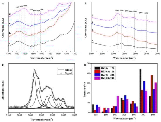 FTIR spectra of the used HZ(0) and HZ(0.8) catalysts after propane aromatization for 12 and 24 h at 550 °C with WHSV of propane being 0.6 h−1 and N2/C3H8 ratio being 2.5 in feedstock in the region of (A) 1700–1300 cm−1 and (B) 3100–2800 cm−1 for (a) HZ(0)-12, (b) HZ(0.8)-12, (c) HZ(0)-24, (d) HZ(0.8)-24; (C) Deconvoluted CH-region (3100–2800 cm−1) spectrum of HZ(0.8)-24; (D) Fraction of intensity (calculated using the area of the peaks in (B) of several characteristic vibrational bands of the catalysts in the FTIR region 2800–3100 cm−1.