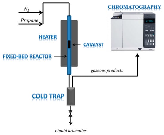 The catalytic test for propane aromatization was carried out on a fixed-bed reactor (i.d. 10 mm) at atmospheric pressure. Fixed-bed reaction process was illustrated in Figure 11. Typically, 2.3 g of catalyst (20–40 mesh) was used per round. The reaction was carried out at 550 °C in a propane/nitrogen flow (42 mL/min) with a N2/C3H8 molar ratio of 2.5 viz. a weight hourly space velocity (WHSV) of propane being 0.6 h−1. The gas and liquid products were separated with a cold trap. The gaseous products including H2, CH4, light olefins and paraffins were analyzed on-line on a gas chromatograph (GC) (Agilent 7890A) equipped with a thermal conductivity detector (TCD, MoleSieve 5A column, 3 m × 1/16 inch × 1 μm) and two flame ionization detectors (FIDs, GC-OxyPlot column, 10 m × 530 μm × 10 μm; Al2O3 column, 50 m × 530 μm × 15 μm). The liquid products including C5+ non-aromatics and aromatics were analyzed by another Agilent 7890A gas chromatograph equipped with a FID and a capillary column (Agilent 19091S-001, 50 m × 200 μm × 0.5 μm). The propane conversion and product selectivity were calculated as below: