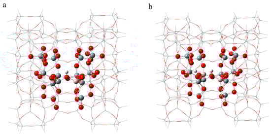 The model of single Al (a) and Al pairs (b) of 120T cluster model over H-ZSM-5. Atom coloring: gray (Si), red (O), white (H), and pink (Al).
