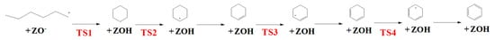 DFT calculations were used to further evaluate the influence of the structure of single AlF and AlF pairs on the propane aromatization process. Here, 1-hexyl cation was applied as reactant to form benzene, because 1-hexyl cation is a typical precursor species (formed by propene []) in propane aromatization. The aromatization of 1-hexyl cation undergoes cyclization, hydride transfer, and dehydrogenation to produce aromatics. As shown in Scheme 2, 1-hexyl cation firstly produces the cyclohexane through cyclization reaction (TS1). Then, the hydride transfer reaction (TS2) between cyclohexane and propoxy leads to the formation of cyclohexyl carbenium ion and propane. After that, the cyclohexyl carbenium ion is converted to benzene by repeated deprotonations and hydride transfer reactions (TS3 and TS4). The calculated kinetic and thermodynamic results are given in Table 6. It should be noticed the deprotonation reaction are not considered because the free energy barrier of deprotonation reaction is quite low, in comparison with that of cyclization and hydride transfer reactions [].
