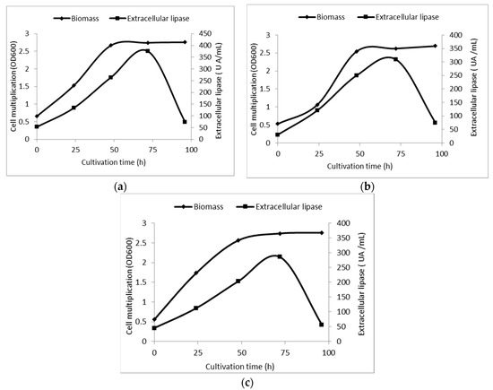 Kinetics of biomass accumulation and extracellular lipase production by Yarrowia lipolytica strains, coded MIUG RD 14 (a), MIUG RD 15; (b) MIUG RD 16; (c) during submerged cultivation (180 rpm at 28 °C) on nutrient broth supplemented with chemicals.