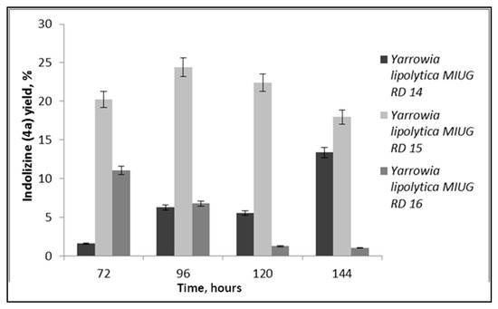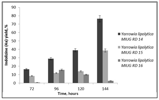 The best bioconversion yield was observed in the presence of the cell-free supernatant obtained after biomass separation by centrifugation from 144 h of submerged cultivation of Yarrowia lipolytica MIUG RD 14, recommending this strain for further research. This crude biocatalyst led to a bioconversion percentage of almost 80% for indolizine 4a, after 4 days of reaction time in an aqueous medium (Figure 5). These results are correlated with metabolites production potential of these strains and confirm the possible implication of them in bioconversion.