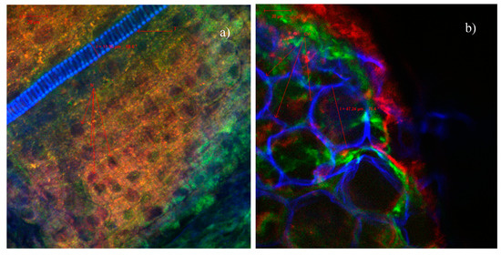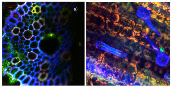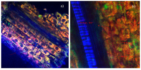 Confocal laser scanning microscopy (CLSM) images of the Triticum estivum L. sprout sections-control sample (germination in ultrapure water): (a) root, (b) shoot.
