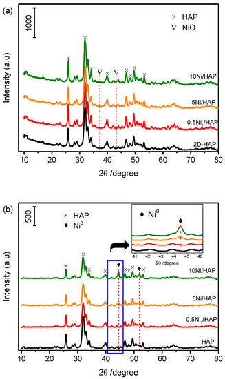 XRD patterns of hydroxyapatite (HAP) and Ni/HAP, before reduction (a), after reduction at 500 °C (b).