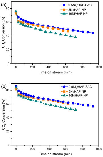The stability DRM reaction over nickel single-atom and nanoparticle catalysts was studied at 750 °C, using 50, 6.16, and 3.65 mg of catalysts for 0.5Ni1/HAP-SAC, 5Ni/HAP-NP and 10Ni/HAP-NP, respectively, which corresponds to similar metallic gas hourly space velocity. As shown in Figure 7, initially, CH4 and CO2 conversions are the same whatever the catalyst composition. It can be seen that CH4 conversion decreased by 25%, 26%, and 36% over 0.5Ni1/HAP-SAC, 5Ni/HAP-NP, and 10Ni/HAP-NP, respectively, after 630 min of reaction. The CO2 conversion followed the same trend and remained higher than the CH4 conversion because of the occurrence of a reverse water gas shift reaction (Equation (1)).