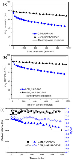 In attempts to reinforce the stability on stream of the prepared single-atom catalysts, the polyvinylpyrrolidone (PVP) assisted synthesis of catalysts was carried out. As shown in Figure 8, with the addition of a small amount of PVP, the initial CH4 (Figure 8a) and CO2 conversion (Figure 8b) reaches 78% and 83%, and only decreases to 68% and 78%, respectively, after 960 min of reaction, exhibiting significantly better stability than the catalyst prepared without surfactant. This enhancement in the catalytic behavior can be attributed to the enrichment of the surface nickel single-atoms on 0.5Ni1/HAP-SAC-PVP, protecting the nickel active site from sintering phenomena during the reaction. In addition, the resulting carbon balance is close to 100% for both catalysts (Figure 8c), proving that carbon deposition is very limited. The H2/CO molar ratio was between 0.68 and 0.97 due to the occurrence of the reverse water gas shift reaction (RWGS).