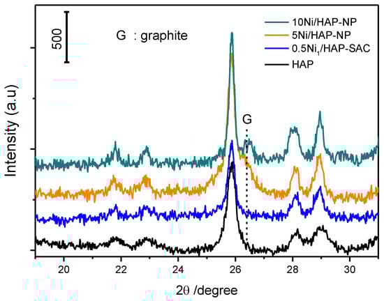 XRD patterns of the as-prepared HAP support and xNi/HAP catalysts with different Ni loading (x = 0.5, 5 and 10 wt%) are displayed in Figure 1a. The diffraction patterns show a unique crystalline phase corresponding to stoichiometric hydroxyapatite Ca10(OH)2(PO4)6 (ICDD 00-001-1008). Moreover, no signals evidencing the existence of NiO or Ni(OH)2 have been detected even at a high loading of nickel (10 wt%).