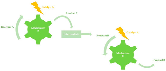 Orthogonal tandem catalysis (Figure 2) uses two or more catalysts that have distinct mechanisms operating concurrently, and the substrate is transformed sequentially [6,7,8].