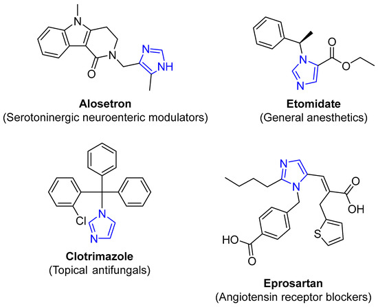 The second most common five-membered aromatic nitrogen heterocycle is imidazole. Imidazole is an important biological interesting heterocycle that is present in the amino acid histidine and possesses catalyst and acid–base functionalities. Imidazole-containing drugs were subdivided into two classes: Monocyclic imidazoles and benzimidazoles; in this review we focus on monocyclic imidazoles (Figure 6) [2,22].