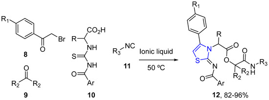 Shahvelayati and co-workers described a direct method for the synthesis of new α-thiazolodepsipeptide derivatives 12 via a multi-component reaction. Thiazole-containing depsipeptides were produced easily in 1-methyl-3-pentylimidazolium bromide from phenacyl bromides 8, ketones 9, thiourea carboxylic acid derivatives 10, and isocyanides 11 in one step by a four-component sequence: Condensation/Passerini tandem reaction (Scheme 3) [25].