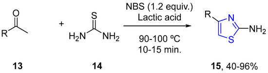 Bodireddy and co-workers, in 2016, generated Hantzsch 2-aminothiazole derivatives 15 in good yields within 10–15 min from aralkyl ketones 13 through in situ regioselective α-bromination followed by heterocyclization in the presence of thiourea 14 in lactic acid at 90–100 °C. This sequence in a single step (Scheme 4) using lactic acid as solvent and catalyst allowed the tandem one-pot synthesis of Hantzsch 2-aminothiazole derivatives 15 [26].